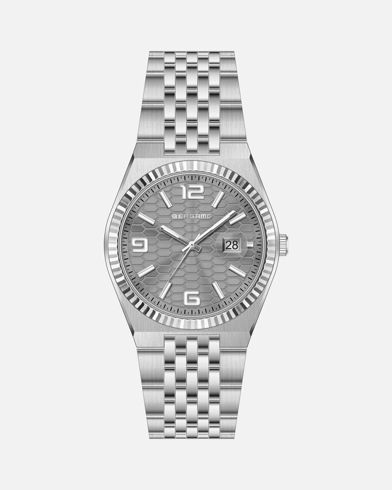 ساعة BERGAMO أنيقة تجمع بين الفخامة والحداثة، تأتي بسوار معدني لمعة وميناء بنقش وبتصميم سداسي فريد يضفي لمسة من التميّز. تتميز بعقارب بارزة ومؤشرات لقراءة واضحة، مع نافذة تاريخ أنيقة تضيف وظيفة عملية للمظهر العصري.