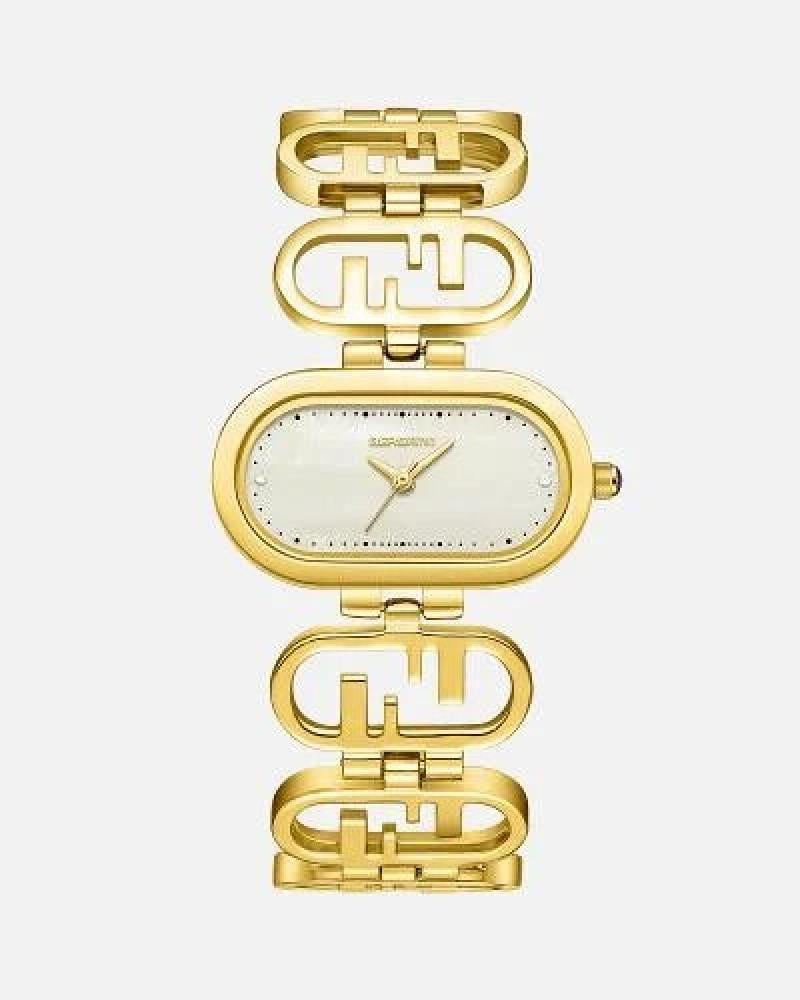 ساعة BERGAMO الذهبية... تجسيد للفن الراقي والأناقة العصرية. ميناء لؤلؤي ناعم يلمع كالضوء في عيون الملوك، وإطار مستطيل أنيق يحتضنه سوارٌ بتصميم هندسي فريد يشبه قطع الفن المعماري. كل تفصيلة فيها تحكي قصة ترف لا يُضاهى، وكأنها بوابة زمنية إلى عالم من الفخامة الخالدة.